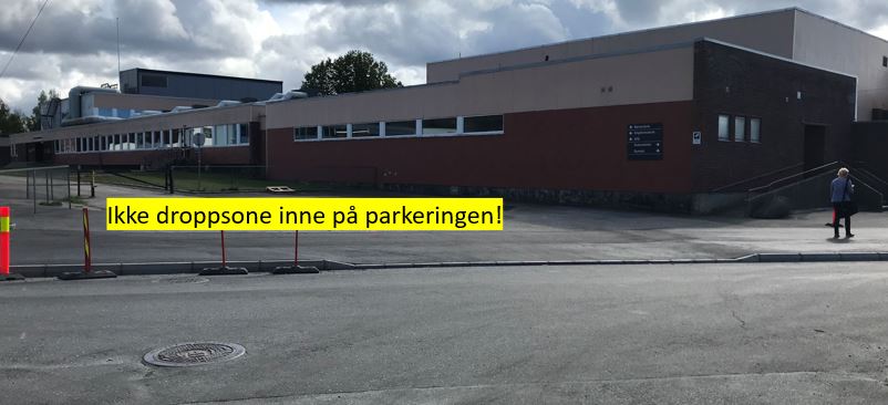 Vi ønsker at du ikke kjører inn på parkeringsplassen foran bommen mellom SFO/gamle biblioteket og svømmehallen for å slippe av barna. Dette skal kun gjøres i droppsonene i Myrstadveien. Se bilder.